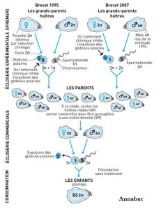 Mais, me direz-vous, comment obtient-on de tels monstres ? C’est arithmétique: il suffit de croiser un mâle tétraploïde avec une femelle diploïde, et hop, le tour est joué. Oui, mais le super-mâle tétraploïde, on le trouve où? Là encore, il suffit d’une petite manipulation génétique, dont l’IFREMER a le secret. Manipulation génétique ? On nous sert donc des plateaux d’OGM à notre insu ? Non, car l’huître triploïde a été modifiée chromosomiquement sans apport de gène étranger, elle n’est donc pas un OGM au sens juridique. Notons au passage que le recours à des hybrides triploïdes est déjà utilisé dans de nombreuses filières végétales et animales (agrumes, céréales, truites …) afin d’obtenir des produits de meilleure qualité, et cela sans que le consommateur n’en soit informé.
